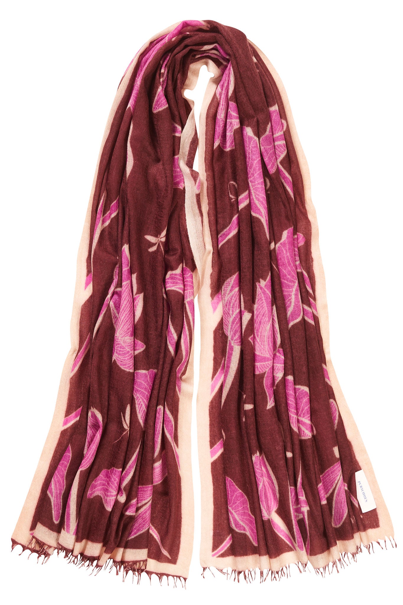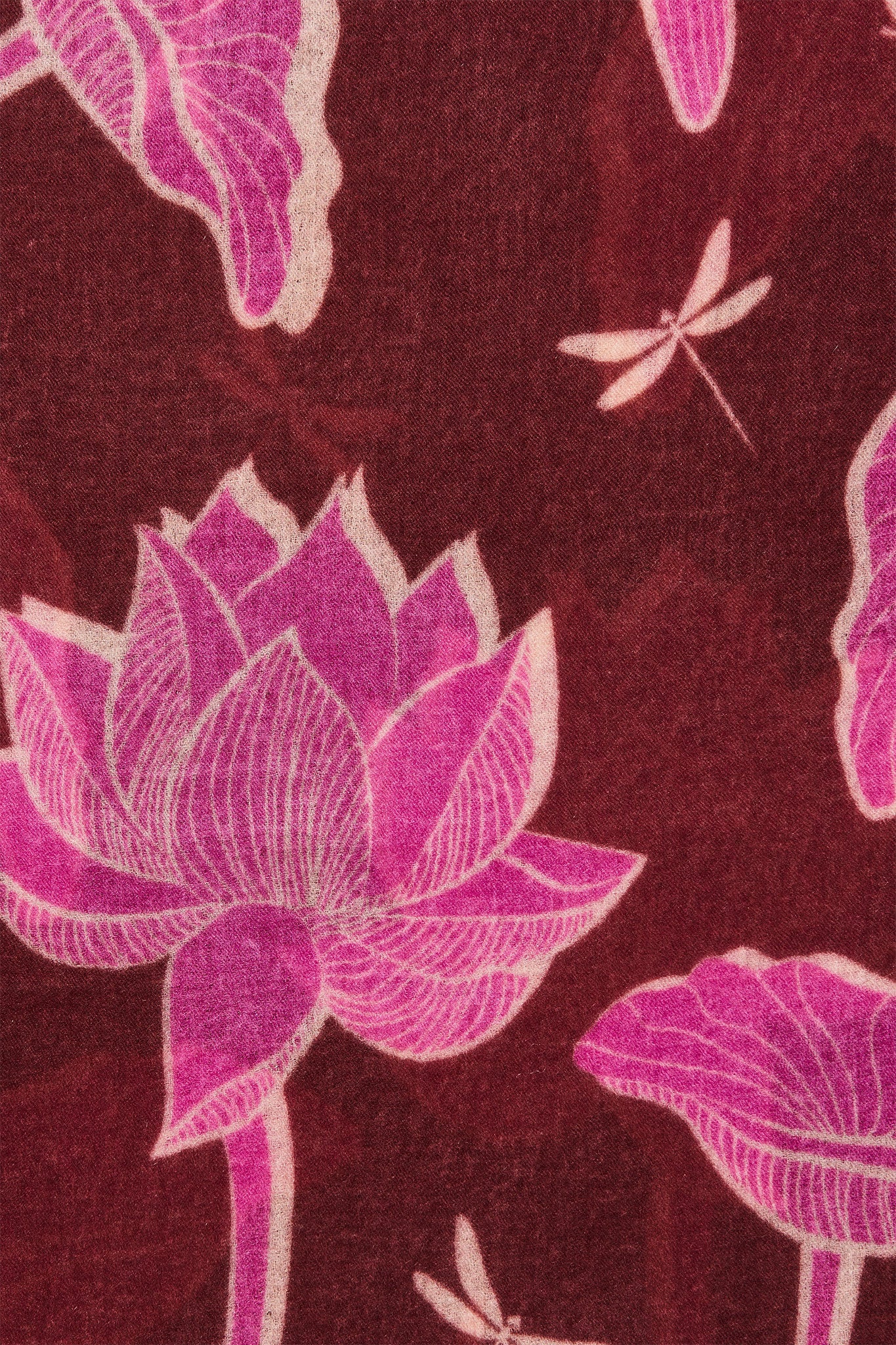 Der gewebte Kaschmirschal Dragonfly Brown Fuchsia setzt ein Statement mit Kontrolle: ein sattes, rötliches Brown als ruhige Fläche, darauf das Dragonfly-Motiv in leuchtendem Fuchsia – klar gezeichnet, grafisch und sehr modern. Lotusblüten und Libellen wirken wie eine elegante Illustration, der helle Rahmen bringt Balance. Weicher, leichter Kaschmir für Looks, die schlicht bleiben dürfen – der Schal macht den Akzent.