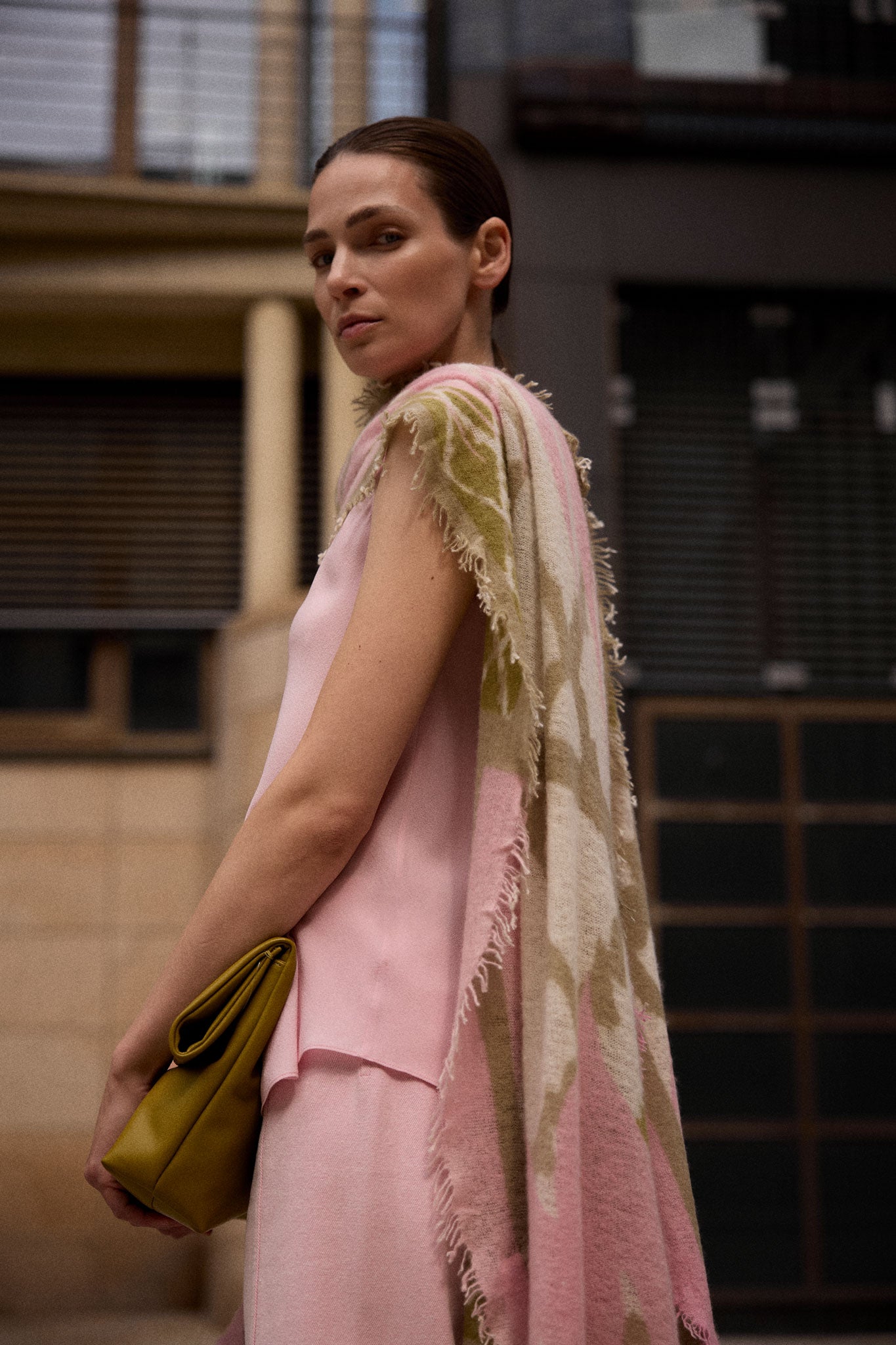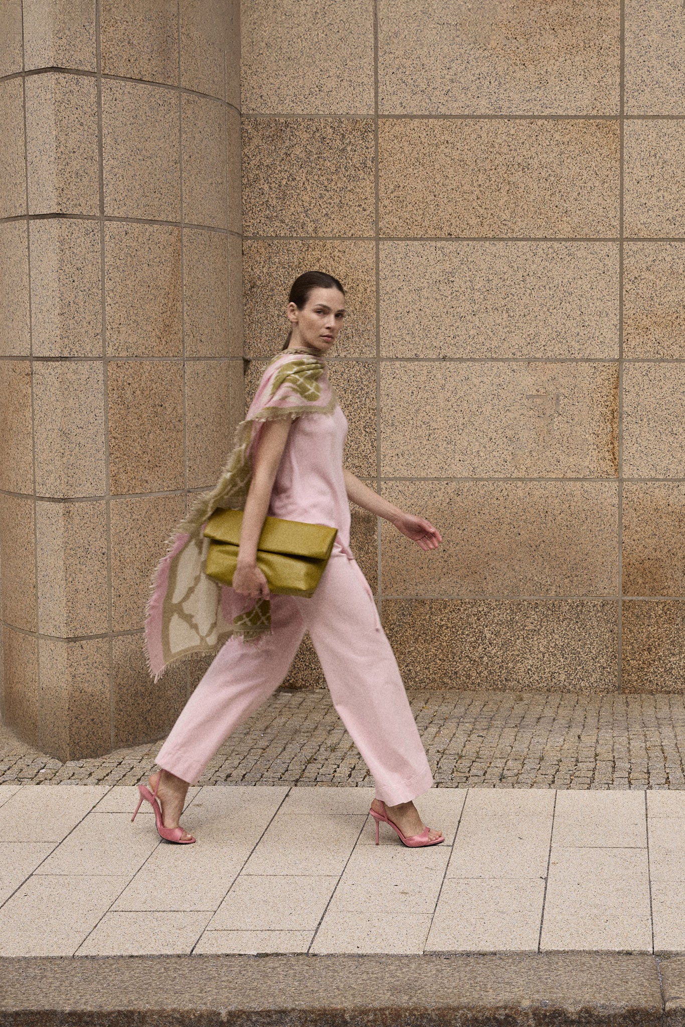Sanfte Rosé- und Cremetöne, akzentuiert von edlem Olivgrün, inszenieren einen federleichten Print im Stil exotischer Palmenblätter. Die harmonische Komposition verströmt feminine Frische und eine subtile, verspielte Eleganz.