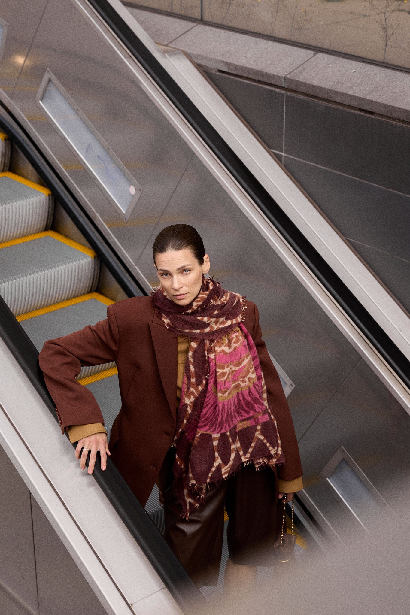 Intensive Rot- und Beerentöne treffen auf markante Tiger-Illustrationen und setzen ein modisches Statement. Ein Schal für ausdrucksstarke Looks mit raffinierter Exotik.
