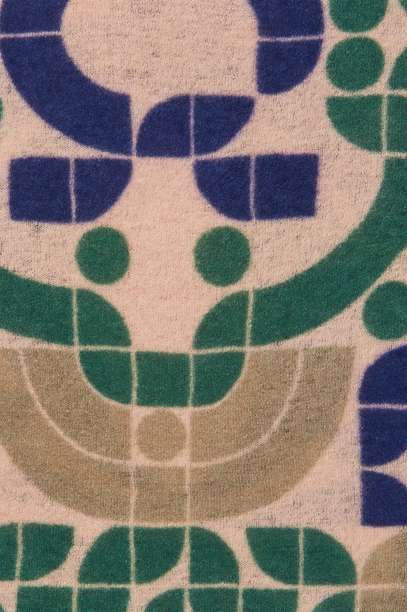 Der Kaschmirschal Reykjavik Camel Classic Green Dark wirkt wie ein modernes Emblem: ein ruhiger Camel-Base-Ton, kombiniert mit sattem Dark Green und tiefem Navy in einem präzise symmetrischen Grafikmuster. Klar, hochwertig, souverän – und dabei erstaunlich vielseitig. Die leicht gefilzte Kaschmirqualität fühlt sich weich an, fällt elegant und wird durch die feine Fransenkante dezent abgerundet.